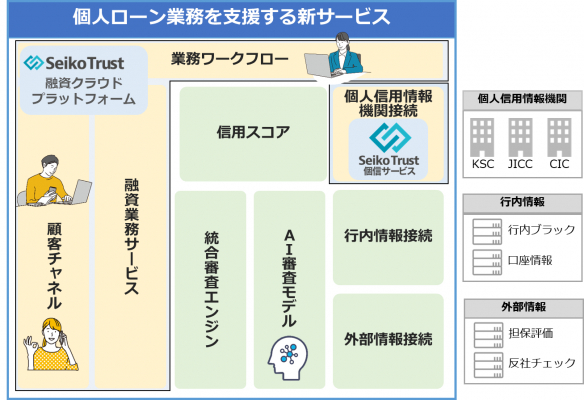 金融機関がより迅速・正確・柔軟な個人向けローン業務を実現できるサービスを目指します。クラウドベースの「融資クラウドプラットフォーム」に、個人信用情報を取得する「Seiko Trust個信サービス」と高度な「AI審査モデル」を統合し開発予定です。
