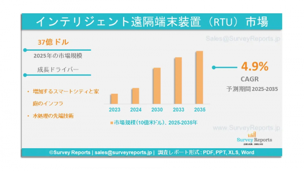 Survey Reports LLCは、2025年6月に「インテリジェントリモートターミナルユニット市場セグメンテーション:通信方式(有線および無線)、コンポーネント(プロセッサ、メモリ、入出力デバイス、電源)、組織(中小企業および大企業)別」というタイトルの研究報告書を発行しました。アプリケーション別(発電所、企業電力部門、住宅、産業、送電・配電)- グローバル市場分析、動向、機会、および予測(2025-2035年)」を発表しました。この報告書は、インテリジェントリモートターミナルユニット市場の予測評価を提供しています。報告書では、成長要因、市場機会、課題、およびインテリジェントリモートターミナルユニット市場における脅威を含む、複数の主要な市場動向を強調しています。