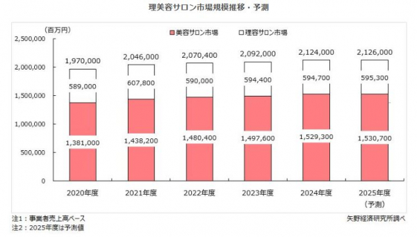 2025年度の理美容サロン市場は2兆1,260億円(前年度比100.1%)と予測する。その内訳は理容サロン市場が5,953億円(同100.1%)、美容サロン市場が1兆5,307億円(同100.1%)である。