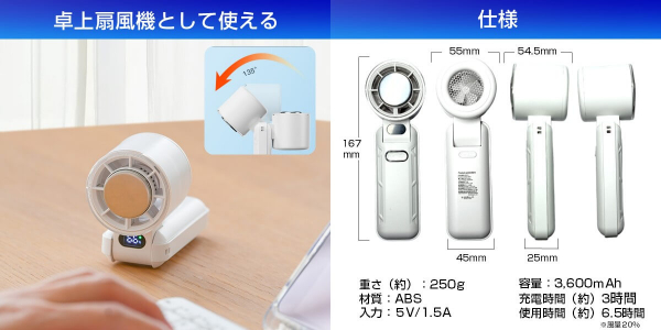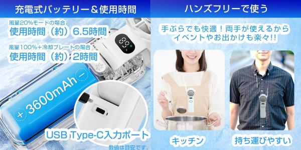 風量最小モードなら長時間使用もOK。繰り返し使えるUSB充電式で、ランニング・通勤通学・アウトドアまで幅広く活躍します。