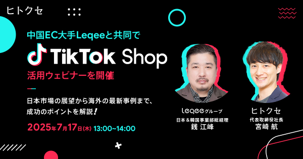 このような状況を受け、日本市場におけるマーケティング知見を持つヒトクセと、中国・米国・東南アジア市場で豊富な実績を持つLeqeeが協力し、TikTok Shopの活用を成功に導くための実践的な情報を提供する運びとなりました。本セミナーが、参加企業の皆様にとって、新たな事業機会を創出する一助となれば幸いです。