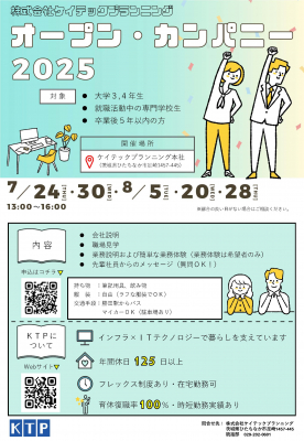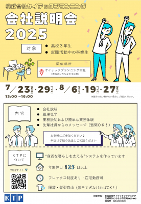 茨城県ひたちなか市で社会インフラのソフトウェア開発事業を手掛ける株式会社ケイテックプランニング(本社:茨城県ひたちなか市、代表取締役社長:安 桂一郎、以下 当社)は、2025年7〜8月に高校生、専門学校生、大学生および卒業生を対象に開催する「会社説明会」「オープンカンパニー」への参加募集を開始いたしました。