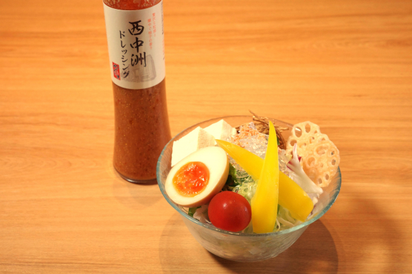 新鮮な葉野菜や、揚げたレンコンやゴボウ、半熟煮たまご、焼明太子(ほぐし)など、10種類以上の具材を使った彩り豊かなサラダ。今だけ味わえるパプリカは、みずみずしく甘みがあり、西中洲ドレッシングとの相性が抜群!ぜひ、たっぷりかけてお召し上がりください。