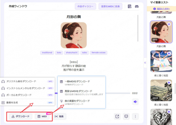 すべての入力が完了したら、「生成」をクリックします。数秒〜数十秒でAIが楽曲を生成し、試聴が可能になります。MIDIファイル、楽譜(PDF)、MP3音源、AI歌詞動画(MP4)としてダウンロードすることもでき、制作や配信に幅広く活用できます。