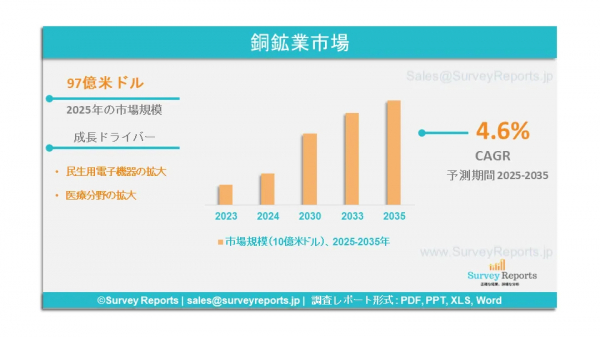 Survey Reports LLCは、2025年6月に「銅鉱山市場セグメンテーション(タイプ別:地下採掘、露天採掘、その他)、用途別(金属加工産業、化学産業、その他)、産業分野別(化学・石油化学、インフラ、輸送、建設、エネルギー・電力、その他)」に関する調査報告書を発行しました。- グローバル市場分析、動向、機会、および予測(2025年〜2035年)は、銅鉱山市場に関する予測評価を提供しています。この報告書では、銅鉱山市場における成長要因、市場機会、課題、および脅威を含む、複数の主要な市場動向を強調しています。
