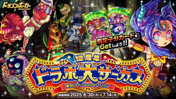 株式会社アソビズム(本社:東京都千代田区、代表取締役:大手智之)は、App Store・Google Playにて好評配信中のリアルタイム合体カードバトル『ドラゴンポーカー』で、2025年6月30日(月)より復刻周年記念スペシャルダンジョン「12周年ドラポ大サーカス」を開催いたします。