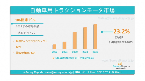 Survey Reports LLCは、2025年6月に「自動車用トラクションモーター市場セグメンテーション:モータータイプ別(AC誘導モーター、DCモーター、永久磁石同期モーター、スイッチドレルクタンスモーター)」に関する調査報告書を発行しました。電圧別(低電圧(690V未満)、中電圧(690Vから1kV)、高電圧(1kV超))、用途別(乗用車、商用車(バス、トラック)、オフハイウェイ車両、産業機械、電動スクーターおよびモーターサイクル); 冷却システム別(液体冷却、空気冷却、ハイブリッド冷却) - グローバル市場分析、動向、機会、および予測(2025年〜2035年)は、自動車用トラクションモーター市場の予測評価を提供します。このレポートでは、自動車用トラクションモーター市場の成長要因、市場機会、課題、および脅威を含む、複数の主要な市場動向を強調しています。