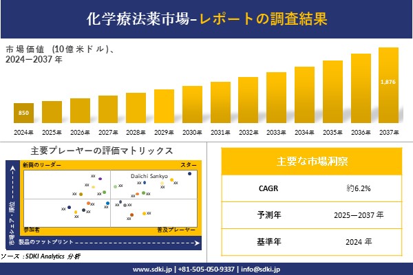 SDKI Analytics(本社:東京都渋谷区)は、このたび、2025年06月30に「化学療法薬市場調査レポート:2025−2037年の市場規模、シェア、傾向の予測」を発表しました。化学療法薬に関する市場調査レポートには、統計的及び分析的アプローチを使用した予測評価が含まれています。この調査レポートでは、一次及び二次調査方法を使用して分析された主要な業界洞察を通じて将来の傾向を理解できるようにすることで、主要な市場動向を読者に説明しています。