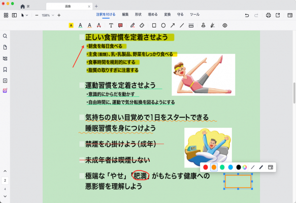 いかなるPDFファイルに注釈を付けられます。ハイライト、下線、取り消し線、図形、コメント、コールアウト、リンク、ペンでの描画、スタンプを追加し、寸法を測定し、さらに署名までできます。