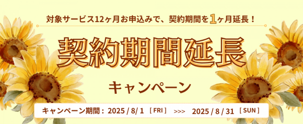 →上記サービスを契約期間12ヶ月間でご契約いただくと、契約期間を1ヶ月間延長!