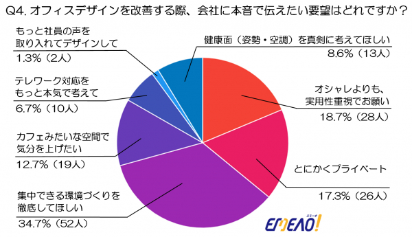 最も多かったのは「集中できる環境づくりを徹底してほしい」で34.7%(52人)と、3人に1人以上が“集中できる職場環境”を最優先事項としていることが分かります。