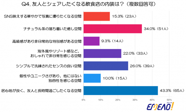 最も多かったのは「居心地が良く、友人と長時間過ごしたくなる空間」(43.3%、65人)でした。30・40代女性にとって、ゆっくりと落ち着いて過ごせる“居心地の良さ”が、友人とシェアしたくなるお店選びの決め手となっていることが分かります。