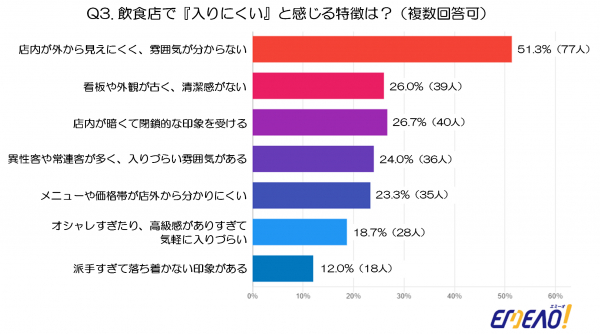 最も多かったのは「店内が外から見えにくく、雰囲気が分からない」(51.3%、77人)という回答でした。やはり、外からお店の様子が分からない場合、不安や警戒心を感じて入店をためらう人が多いことがわかります。