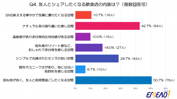 最も多かったのは「居心地が良く、友人と長時間過ごしたくなる空間」(50.7%、76人)でした。単なる見た目の良さよりも『くつろげる雰囲気』や『長居できる快適さ』が重視されていることが分かります。