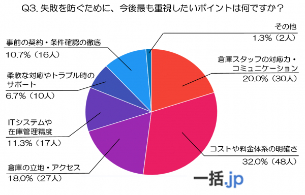 そこで今回、物流倉庫や発送代行業者を厳選して紹介するBtoBマッチングサイト『一括.jp(https://emeao.jp/ikkatsu-column/shippingagency_recommendation/ )』は、実際に物流倉庫の運営や管理に携わっている担当者150名を対象に「失敗経験」「失敗の具体的理由」「重視したいポイント」「有効な失敗防止策」など、現場のリアルな声を徹底的に集めました。