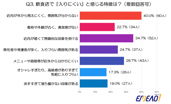 最も多かったのは「店内が外から見えにくく、雰囲気が分からない」(40.0%・60人)で、外から店内の様子が見えないことが“心理的なハードル”になっていることが分かります。