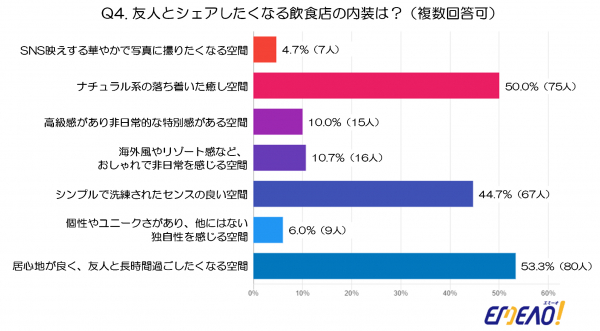 「海外風やリゾート感など、おしゃれで非日常を感じる空間」(10.7%・16人)や「高級感があり非日常的な特別感がある空間」(10.0%・15人)、「個性やユニークさがあり、他にはない独自性を感じる空間」(6.0%・9人)、「SNS映えする華やかで写真に撮りたくなる空間」(4.7%・7人)はいずれも少数派となっており、非日常感やインパクト、写真映えよりも、落ち着きや癒し・居心地の良さが友人とシェアしたくなる飲食店のポイントであることが読み取れます。