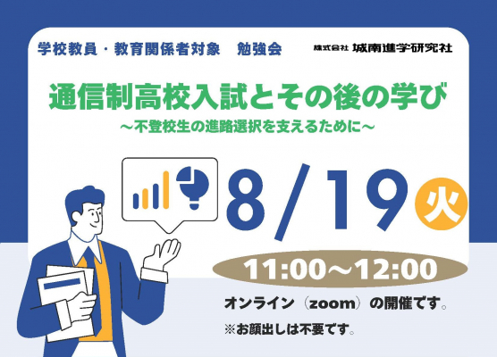 株式会社城南進学研究社(本社:神奈川県川崎市、代表取締役社長CEO:下村勝己、以下「当社」)は、2025年8月19日(火)、「通信制高校入試とその後の学び〜不登校生の進路選択を支えるために〜」を開催します。一般的な通信制高校の入試情報から不登校児向けの入学前準備まで、学校教員・教育関係者を対象とした勉強会です。