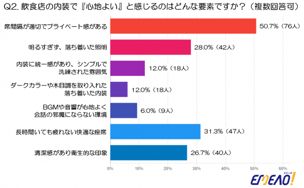 一方で、「内装に統一感があり、シンプルで洗練された雰囲気」(12.0%、18人)、「ダークカラーや木目調を取り入れた落ち着いた内装」(6.0%、9人)、「BGMや音響が心地よく会話の邪魔にならない環境」(9.3%、14人)は少数派となっており、デザイン性や音響よりもプライバシーや快適さを求める傾向が見られます。