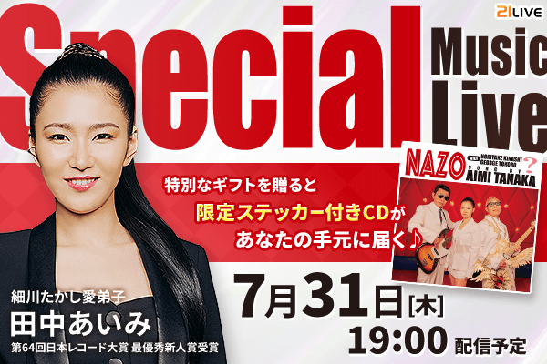 2025年7月31日(木)19時より、ライブ配信アプリ「21LIVE」にて、田中あいみによるスペシャル配信を開催します。