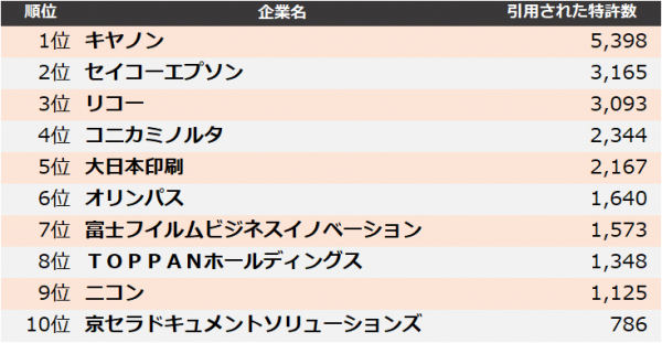 集計の結果、2024年に最も引用された企業は、1位 キヤノン、2位 セイコーエプソン、3位 リコーとなりました。