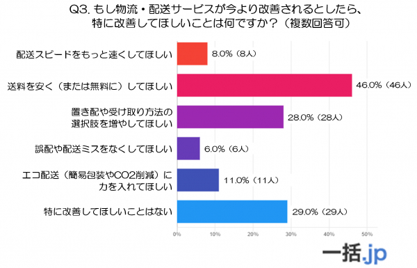 その他、「エコ配送(簡易包装やCO2削減)に力を入れてほしい」は11.0%(11人)、「配送スピードをもっと速くしてほしい」は8.0%(8人)、「誤配や配送ミスをなくしてほしい」は6.0%(6人)と、いずれも一部に関心があるものの、優先度としては限定的な傾向が見られました。