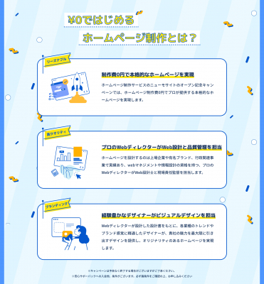 初期費用を完全無料にすることで、ホームページ制作の第一歩を圧倒的に踏み出しやすくしました。費用は月額料金のみ。隠れた費用は一切なく、予算計画が立てやすい明瞭な料金体系を実現しています。