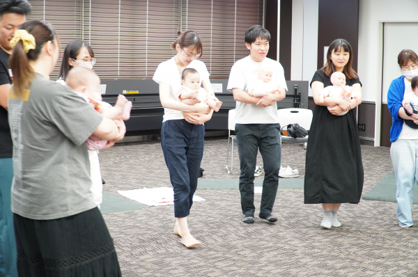 前半は、当法人公認インストラクター・曳田彩加が、産前産後の養生法や赤ちゃんの抱っこ、遊び方についてレクチャーを行いました。
