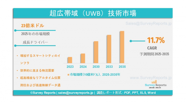 Survey Reports LLCは、2025年7月に調査報告書『ウルトラワイドバンド(UWB)技術市場のセグメンテーション:タイプ別(インパルス無線、マルチバンドUWB)、用途別(RTLS、イメージング、通信、その他)、エンドユーザー別(ヘルスケア、自動車・輸送、製造業、コンシューマーエレクトロニクス、小売、その他)― 世界市場分析、動向、機会、予測(2025年〜2035年)』を発表した。本報告書は、UWB技術市場の予測評価を提供し、成長要因、市場機会、課題、脅威といった主要な市場ダイナミクスを明らかにしている。