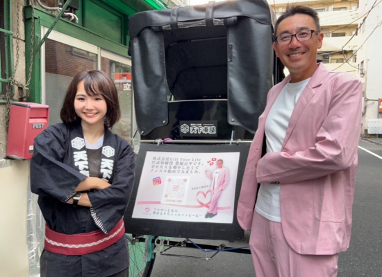 本企画は、人力車「天下車屋」とのコラボレーション。番組の毎月第2週コメンテーターである、株式会社Gift Your Life 代表・豊福公平さんの特製ポスターを掲げた人力車が、雷門界隈を疾走します。
