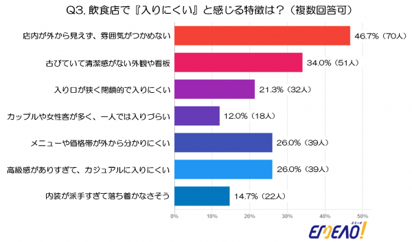 最も多かったのは、「店内が外から見えず、雰囲気がつかめない」で、46.7%(70人)が回答しました。中の様子が見えないことに不安を感じ、「入りにくい」と思わせる一因になっているようです。