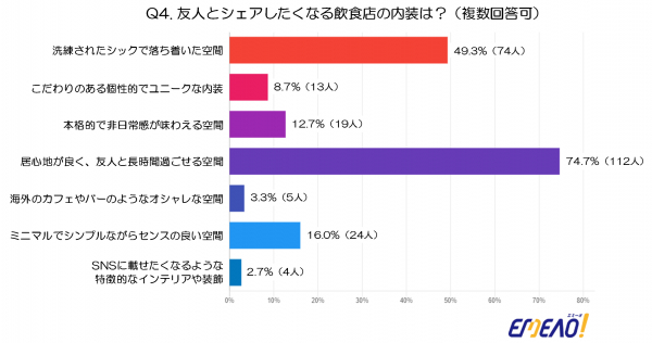 最も多かったのは、「居心地が良く、友人と長時間過ごせる空間」で、74.7%(112人)が回答しました。シェアしたくなる店とは、居心地の良さがあり、会話や時間を楽しめる空間であることがポイントになっているようです。