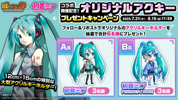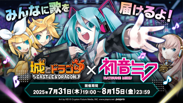 株式会社アソビズム(本社:東京都千代田区、代表取締役:大手智之)は、App Store・Google Playにて好評配信中の『城とドラゴン』で、『初音ミク』との初のコラボイベントを2025年7月31日(木)19:00より開催いたします。