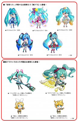 7月31日(木)より、『初音ミク』との初のコラボイベントを開催いたします。期間中はコラボ限定キャラ「初音ミク」が豪華オリジナルボイス付きで『城ドラ』に初参戦!また「ホワドラガール」など城ドラキャラのコラボ限定お着替えが登場することに加え、「千本桜」など人気楽曲がBGMとして試聴可能に!ミッションの報酬では「巡音ルカ」になりきれる剣士お着替えや、初音ミクが歌う特別バージョンの人気ガールキャラテーマソング2曲もゲーム内BGMとして獲得可能!さらにショップでは、ゲーム内のシステムボイスをコラボ後も変更できるようになる初音ミクの「ボイスパック」が発売!期間限定のコラボイベントをぜひお楽しみください。