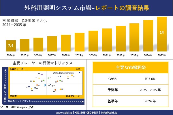 SDKI Analytics(本社:東京都渋谷区)は、このたび、2025年07月30に「外科用照明システム市場調査レポート:2025−2035年の市場規模、シェア、傾向の予測」を発表しました。外科用照明システムに関する市場調査レポートには、統計的及び分析的アプローチを使用した予測評価が含まれています。この調査レポートでは、一次及び二次調査方法を使用して分析された主要な業界洞察を通じて将来の傾向を理解できるようにすることで、主要な市場動向を読者に説明しています。