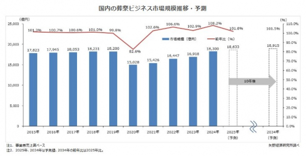 【矢野経済研究所プレスリリース】葬祭ビジネス市場に関する調査を実施(2025年) 2024年の葬祭(フューネラル)ビジネス市場規模は前年比108.2%の1兆8,300億円と推計