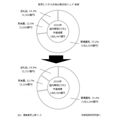 2024年の国内葬祭ビジネス市場規模(事業者売上高ベース)は、前年比108.2%の1兆8,300億円と推計した。