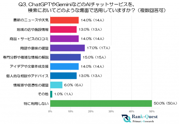最も多かったのは、「特に利用しない」という選択で、全体の50.0%(50人)に達しています。検索の場面ではAIチャットを使わず、従来の検索方法に頼る人が依然として多数派であることがわかります。