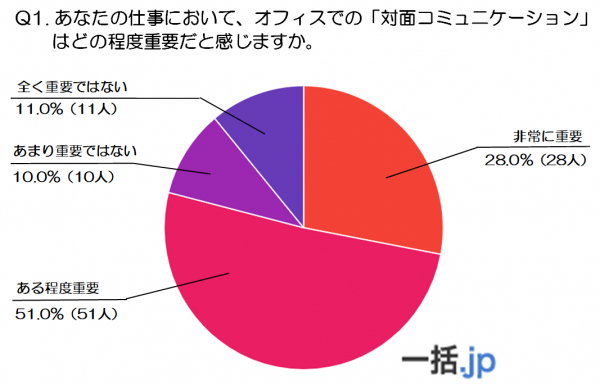 最も多かったのは、「ある程度重要」と回答した方で、全体の51.0%(51人)を占めました。「非常に重要」と答えた方も28.0%(28人)おり、合わせて約8割の方が、対面でのコミュニケーションを業務上「重要」と感じていることがわかります。
