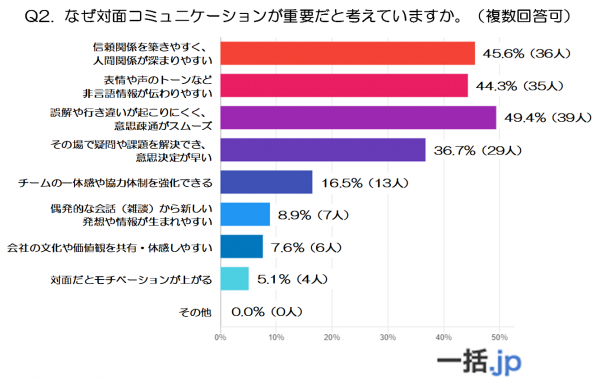 次いで、「信頼関係を築きやすく、人間関係が深まりやすい」が45.6%(36人)、「表情や声のトーンなど非言語情報が伝わりやすい」が44.3%(35人)となっており、対面コミュニケーションが人間関係の構築においても重視されていることがわかります。