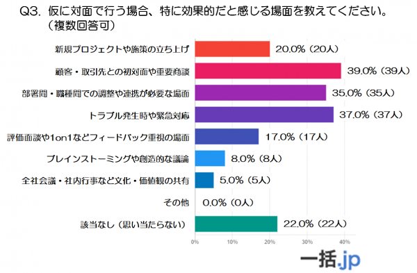 次いで、「トラブル発生時や緊急対応」が37.0%(37人)、「部署間・職種間での調整や連携が必要な場面」が35.0%(35人)となっており、状況判断や柔軟な対応が求められる局面では、対面のスピード感や臨機応変さが有効と感じている人が多いようです。