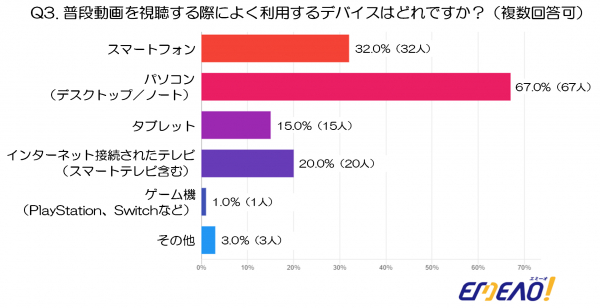 最も多かったのは「パソコン(デスクトップ/ノート)」で67.0%(67人)が利用しており、動画視聴の中心的なデバイスとなっていることが分かります。