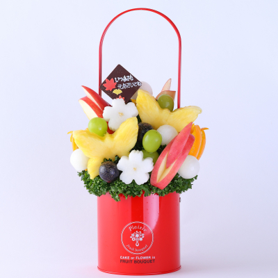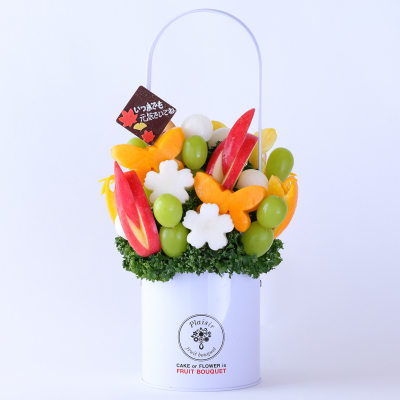 瑞々しい旬の果物を華やかにアレンジし、チョコレートプレートには「いつまでも元気でいてね」のメッセージを添えて。