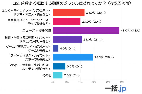 最も多かったのは「ニュース・時事問題」で48.0%(48人)が選んでおり、動画が情報収集の主要な手段として根付いていることが分かります。特にニュースは紙媒体やテレビに加え、オンライン動画を通じても確認されており、習慣的に利用されている様子がうかがえます。