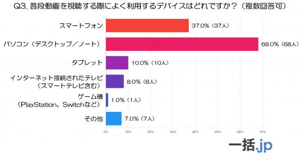 最も多かったのは「パソコン(デスクトップ/ノート)」で68.0%(68人)が利用しており、動画視聴の中心的なデバイスであることが明らかになりました。操作性や画面サイズの大きさなど、パソコンならではの利点が選ばれる理由と考えられます。