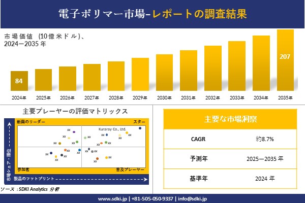 SDKI Analytics(本社:東京都渋谷区)は、このたび、2025年08月27に「電子ポリマー市場調査レポート:2025−2035年の市場規模、シェア、傾向の予測」を発表しました。電子ポリマーに関する市場調査レポートには、統計的および分析的アプローチを使用した予測評価が含まれています。この調査レポートでは、一次および二次調査方法を使用して分析された主要な業界洞察を通じて将来の傾向を理解できるようにすることで、主要な市場動向を読者に説明しています。