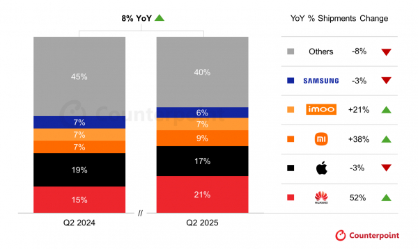 ・Huaweiの世界出荷台数シェアは、中国での力強い成長と他地域への戦略的進出により、2025年第2四半期に過去最高の20%に達しました。
