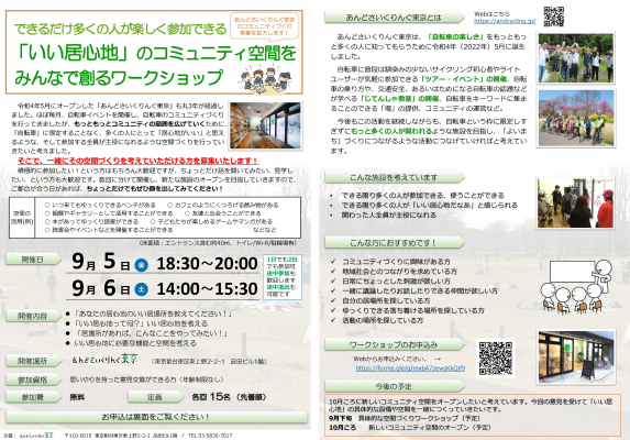 しかし、これまで自転車に乗る楽しさや、地域の魅力を体験する楽しさをもとに集客を行ってきたあんどさいくりんぐ東京としては、それらがなかった時にどうやって多くの人に集まってもらったら良いのかがわかりません。そこで辿り着いた答えが「いい居心地」です。「居心地がいい」空間には人が集まります。では「いい居心地」って何だろう、と考えた時に、せっかくですから、これからこの施設を使っていただける方々と一緒に考えたいと思いました。思いやりを持った意見交換ができる方であれば、どなたでもご参加いただけます。
