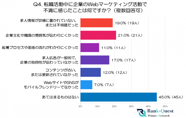 一方で、「企業文化や職場の雰囲気が伝わりにくかった」が21.0%(21人)、「求人情報が詳細に書かれていない、または不明確だった」が19.0%(19人)と続き、応募判断に直結する情報の不足が課題として浮かび上がっています。