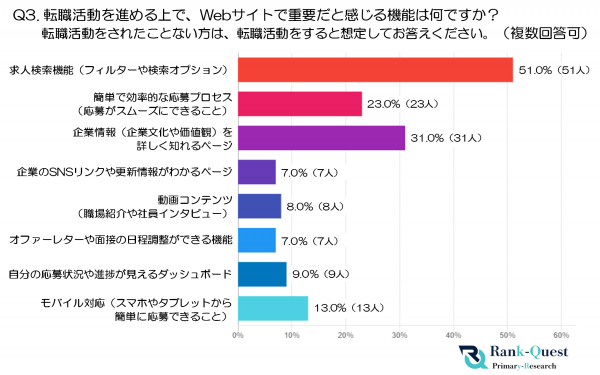一方で、「モバイル対応」13.0%(13人)、「自分の応募状況や進捗が見えるダッシュボード」9.0%(9人)、「動画コンテンツ」8.0%(8人)、「企業のSNSリンクや更新情報がわかるページ」7.0%(7人)、「オファーレターや面接の日程調整ができる機能」7.0%(7人)はいずれも1割前後にとどまり、補助的な機能として認識されていることが分かります。